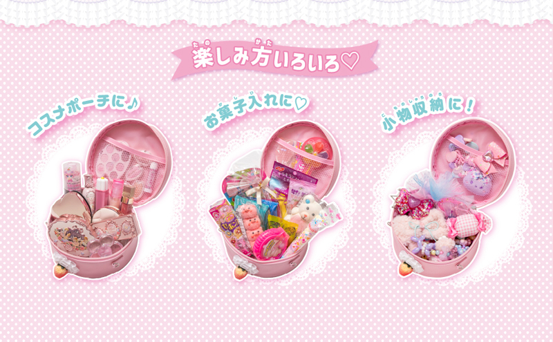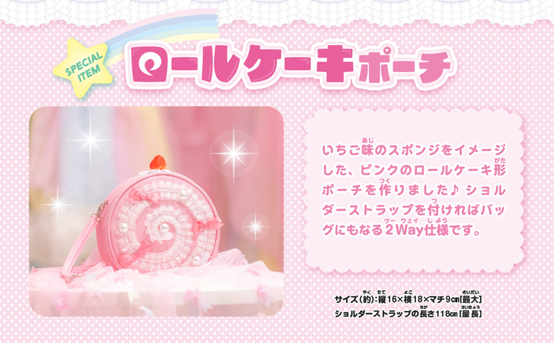特別アイテムのロールケーキポーチは、いちごスポンジをイメージしたピンクのデザイン。