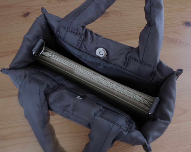 バッグのサイドが少し膨らんだ状態になります。バッグ内の他のものが出し入れしづらくなるので、お財布を入れるならコンパクトタイプが向いていると思います。