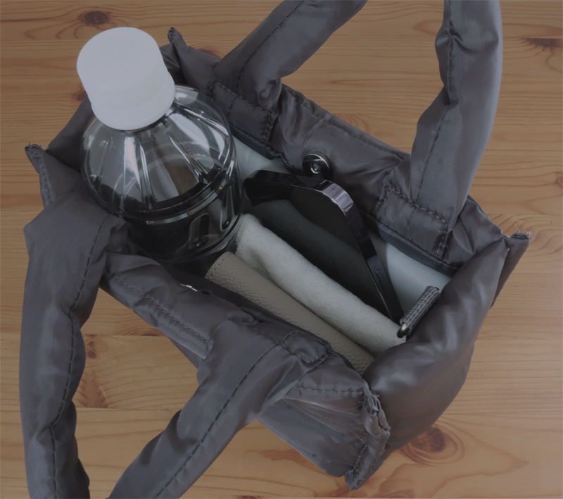 500mLペットボトルを立てて入れるとバッグの口から少し見えます。
