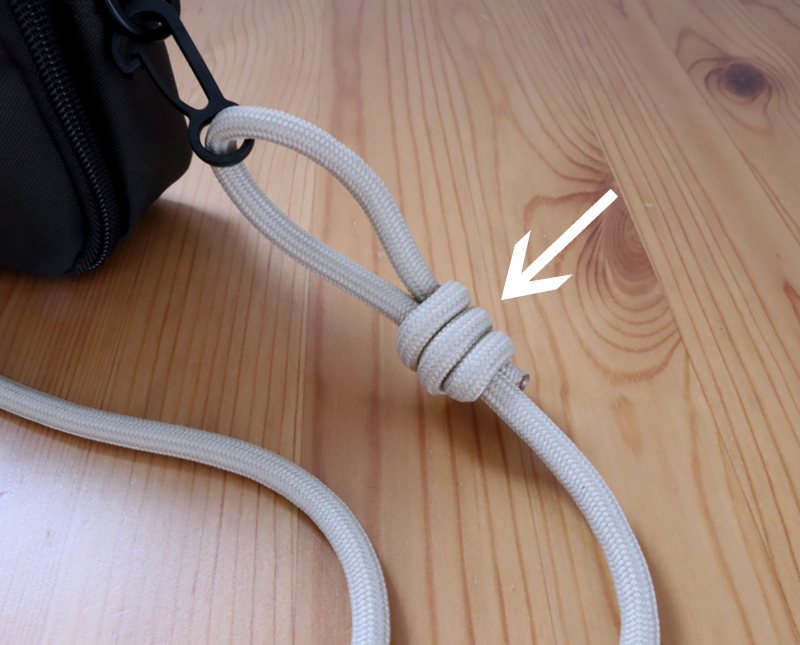矢印部分を押さえて紐を引けば長さ調節が可能。斜め掛けでもワンショルダーでも好みに合わせて使えます。
