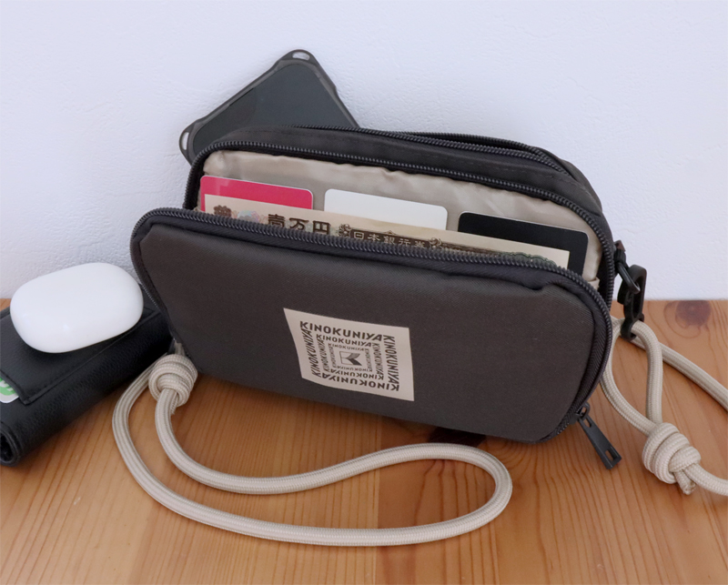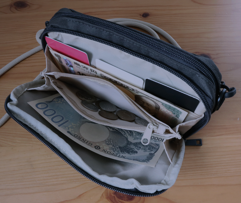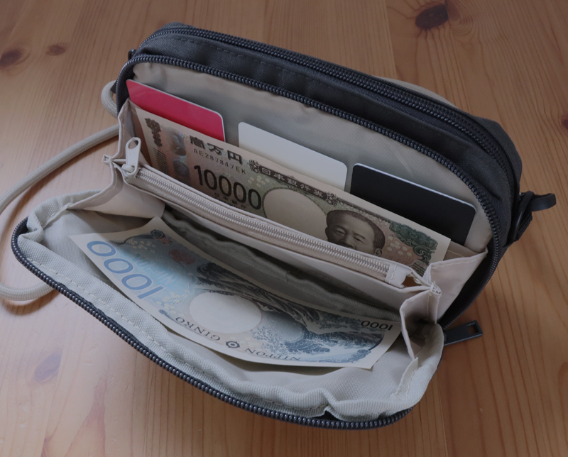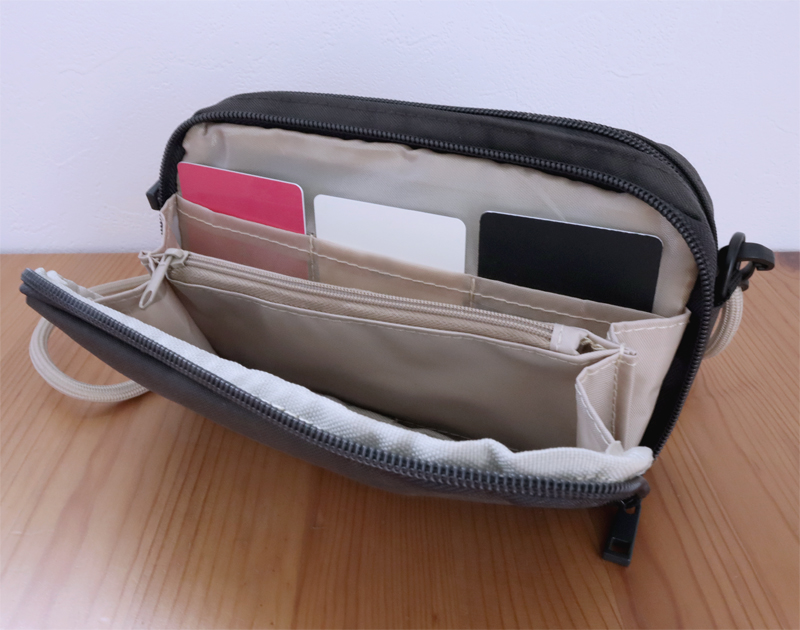 ダブルファスナーを開けると財布の機能が付いています。カードポケットは3枚分。ポケット部分の生地が薄手で透けるものの、カードはきちんと収まります。