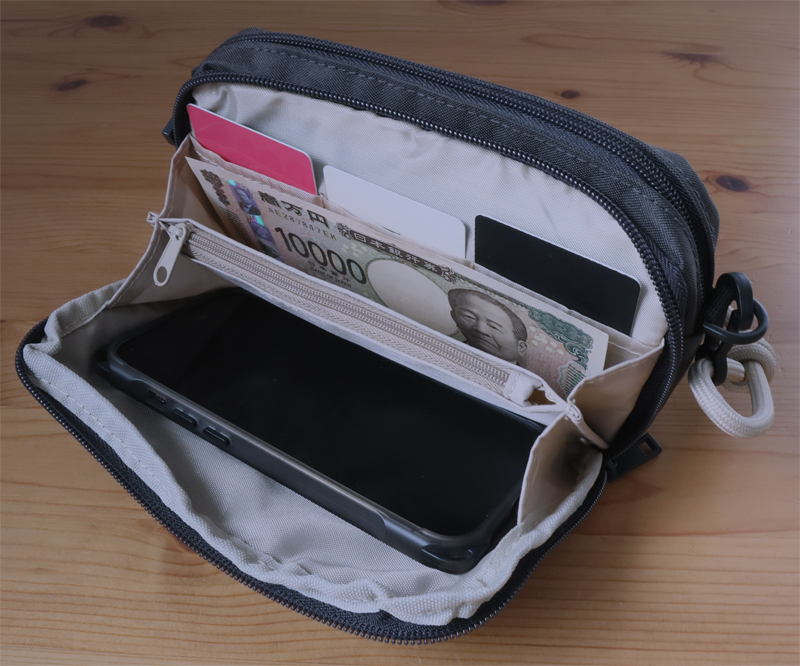 2ヵ所の仕切りスペースにはお札やスマホが入ります。