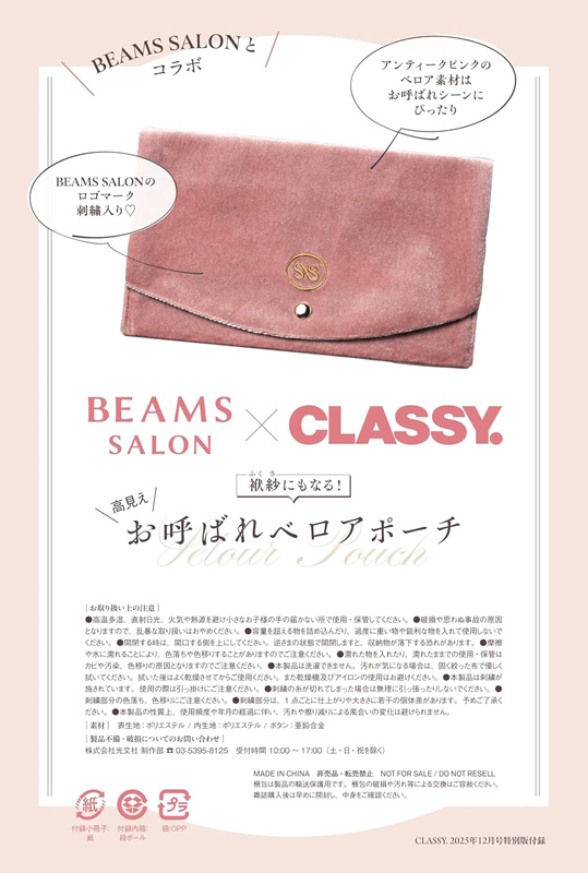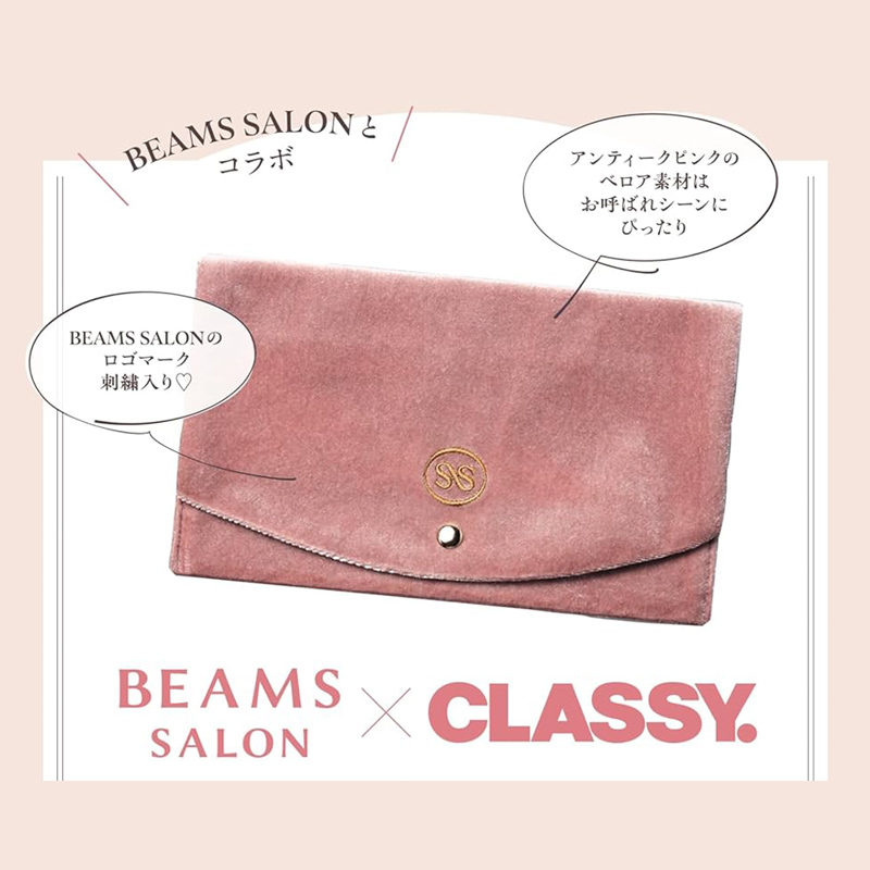 CLASSY. 12月号 特別版の付録は、BEAMS SALONとコラボしたベロアポーチ。