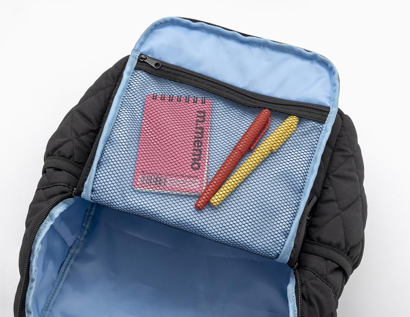 メイン収納の内側には中身が見えるメッシュポケット付き。細々したアイテムもすっきり収納。