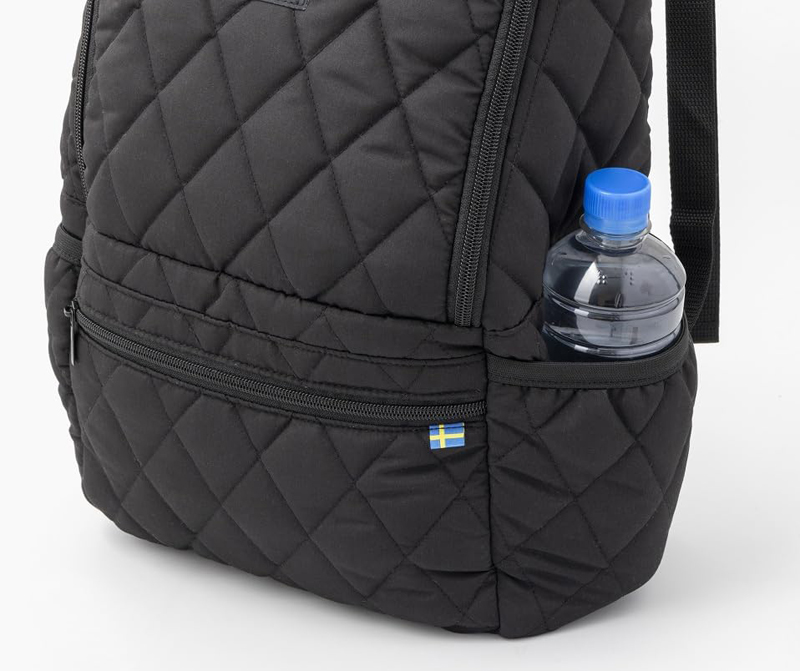 両サイドにはペットボトルや折りたたみ傘が入るポケット付き。背負ったまま出し入れできて便利。