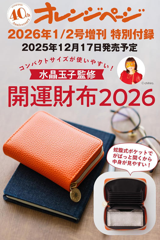 大人気のレジェンド占い師・水晶玉子先生と『オレンジページ』のコラボ付録「開運コンパクト財布2026」が完成しました!