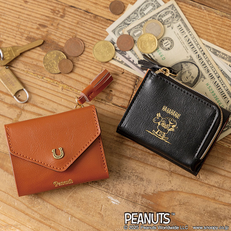 L字に大きく開く札入れと、パカッと開いて中身が見やすいコイン入れの生地は、ウエスタンスタイルに身を包んだスヌーピーとチャーリー・ブラウンの総柄で、開くたびに楽しい気持ちになります♪