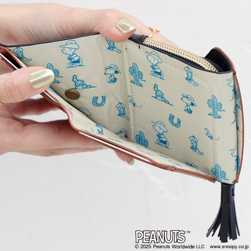L字に大きく開く札入れと、パカッと開いて中身が見やすいコイン入れの生地は、ウエスタンスタイルに身を包んだスヌーピーとチャーリー・ブラウンの総柄で、開くたびに楽しい気持ちになります♪