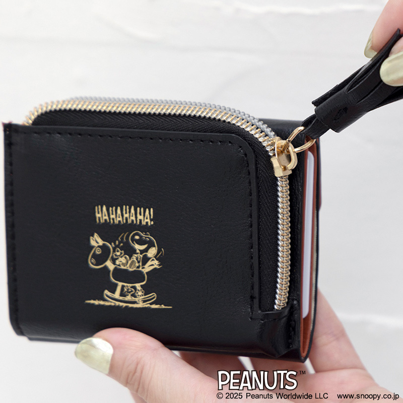 木馬で遊ぶスヌーピーとウッドストックのデザインが高級感のあるゴールドで箔押しされたコンパクトなお財布。