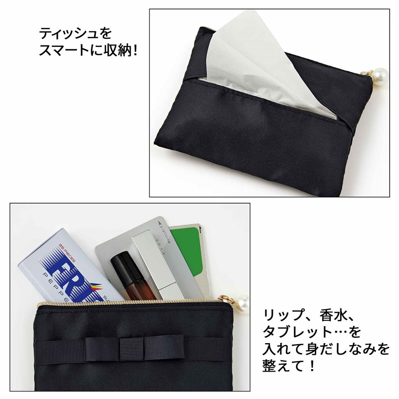 カード型のポーチに、背面にはポケットティッシュが入るダブルポケットタイプ。