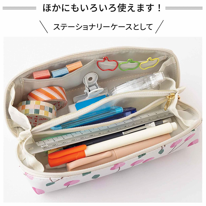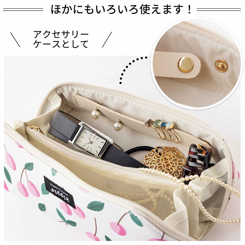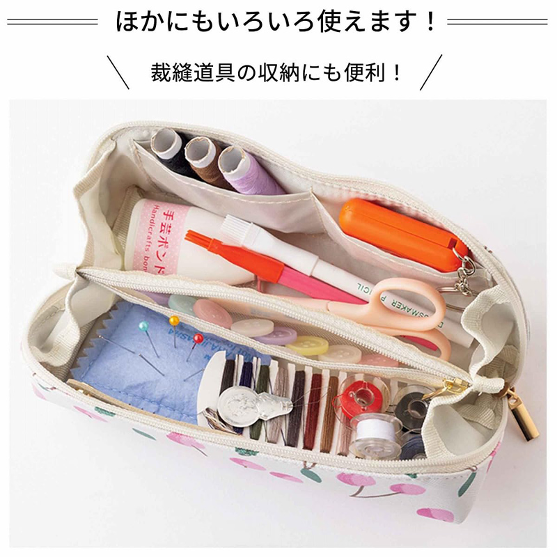 大小合わせて3つの内ポケットつきで、メガネやアクセサリーのほか、コスメや文房具、お裁縫道具などもすっきりひとまとめにできます。