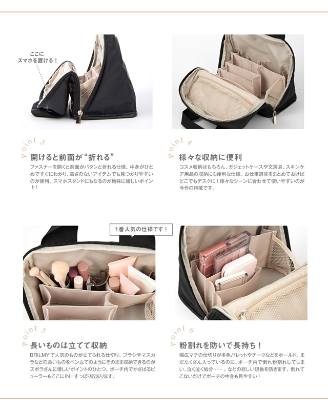 幅広マチの仕切りが多色パレットやチークなどをホールド。まだたくさん入っているのに、ポーチ内で倒れ粉割れしてしまい、泣く泣く処分……。などの悲しい現象を防ぎます。倒れてこないだけでポーチの中身も見やすい!