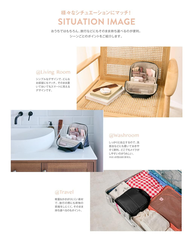 コスメ収納はもちろん、ガジェットケースや文房具、スキンケア用品の収納にも便利な仕様。お仕事道具をまとめておけばどこでもデスクに!様々なシーンに合わせて使いやすいのが今作の特徴です。