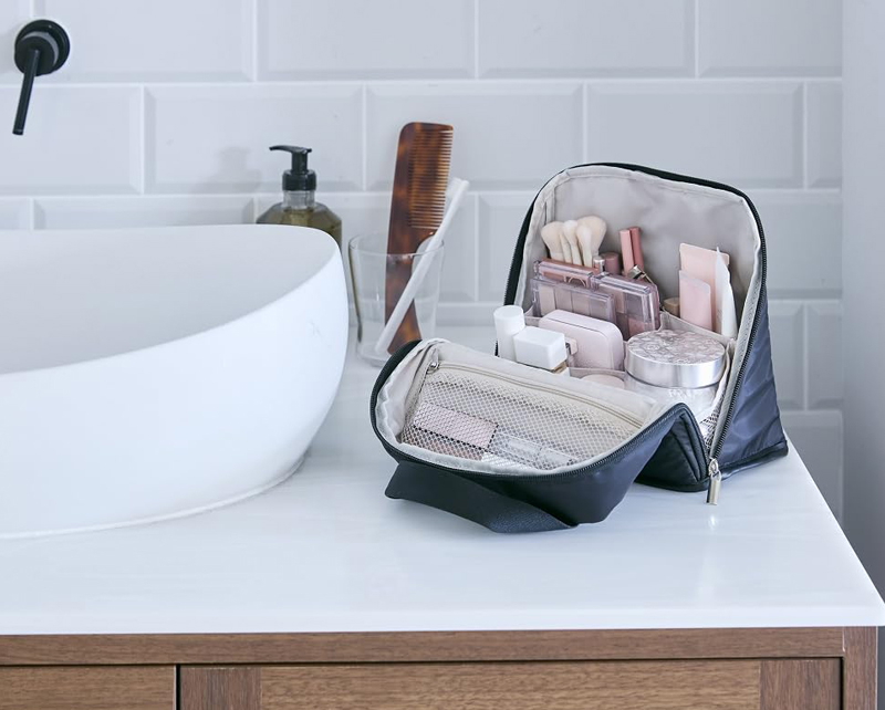 しっかりと自立するので、洗面台などにも置いておきやすく便利。どこでもメイクがしやすいのがうれしい。※はっ水性はありません