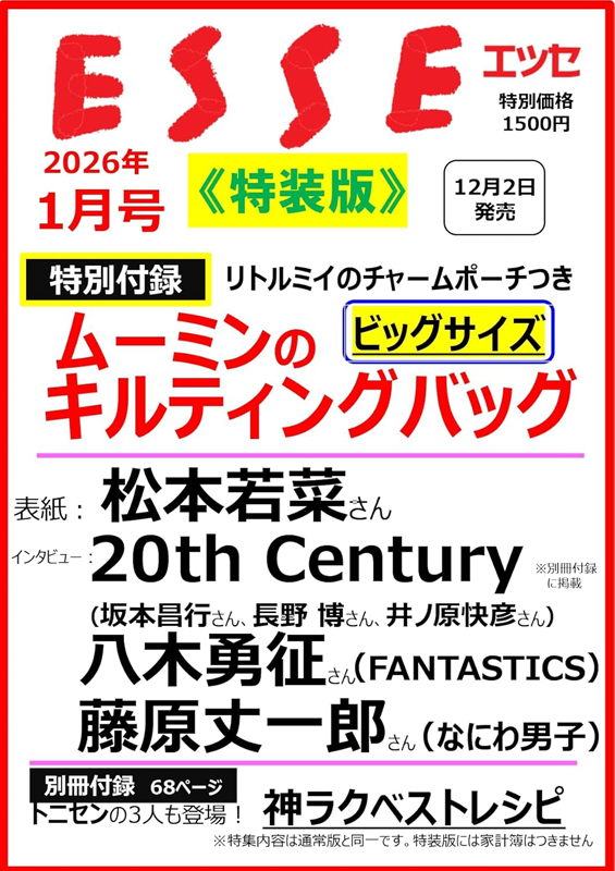 <予告> ESSE エッセ 2026年 1月号 増刊特装版 【付録】 ムーミン キルティングバッグ&チャームポーチ