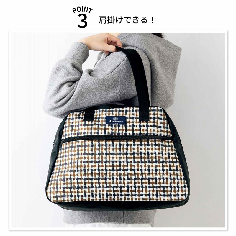 前面と背面にクラブチェックをあしらい側面をブラックのコンビにして、持ちやすく洗練された印象に仕上げたビッグサイズのボストンバッグ。