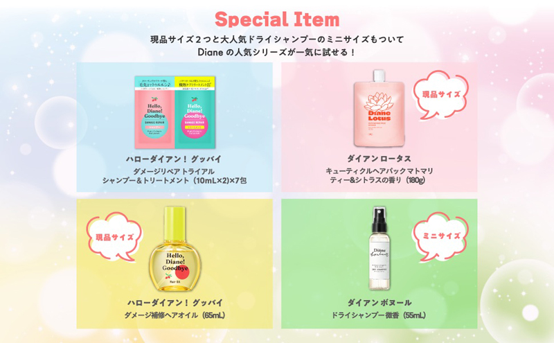 現品サイズのヘアパックとヘアオイル、外出先で大活躍の大人気ドライシャンプーのミニサイズ、そしてシャンプー&トリートメントのサシェが7包もついた、贅沢な詰め合わせ。