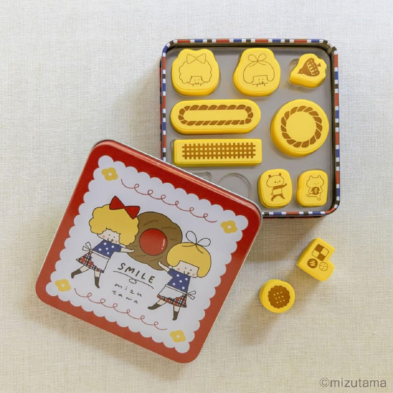 \大人気けしごむはんこ作家「mizutama」さんの、クッキーみたいなはんこと缶のセットが完成しました。/
