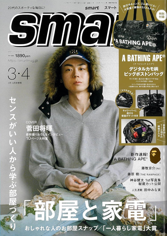 smart3月・4月合併号では、A BATHING APE®とのコラボレーションで「キャリーケースにセットできる!ビッグボストンバッグ」が登場します。