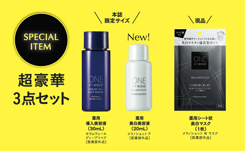 本誌限定サイズのセラムヴェール ディープリペア[医薬部外品] 30mL、新商品の美容液[医薬部外品] 20mL、現品サイズのメラノショット W マスク[医薬部外品] 1枚と、新商品のほか、人気商品も試せる特別セット付きです。
