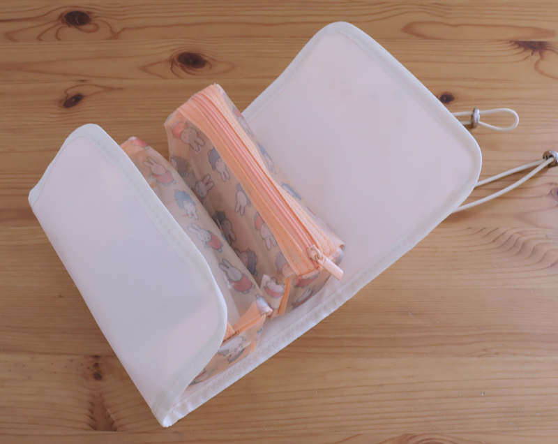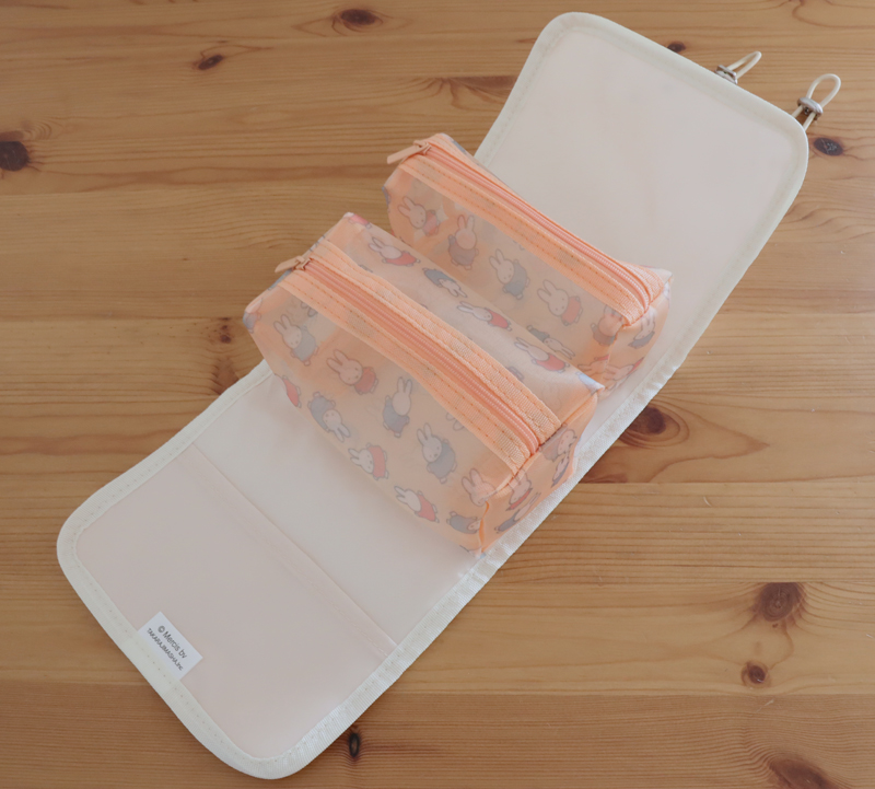2つのポーチが取り外しできる便利なつくり。メイクの時はケースを広げて使えば中身が一目で分かります。旅先の洗面所や浴場で使うものをまとめておいて、外して持ち歩くのも便利だなと思いました。