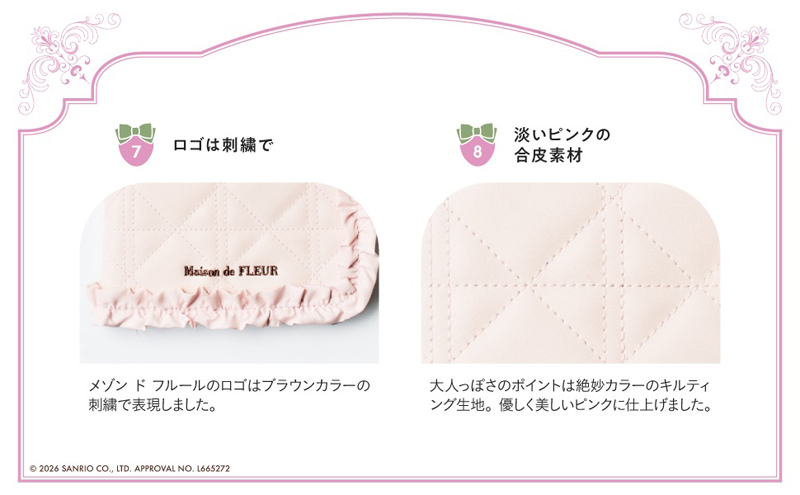 高級感のあるキルティング素材に、もこもこ素材&繊細な刺繍で仕上げたキティデザイン。