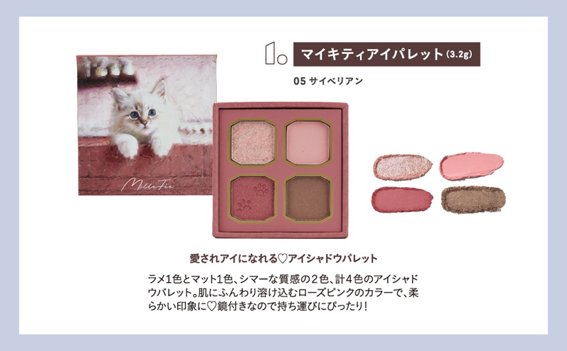 人気の猫シリーズからマイキティアイパレット、絵画シリーズからアイライナー、そしてグラマラスリッププランパー。