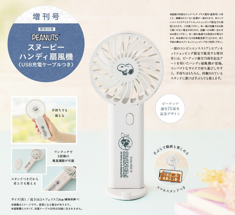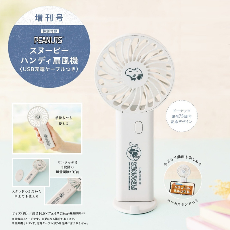 一部のコンビニエンスストアとセブンネットショッピング限定で販売する増刊号には、ピーナッツ誕生75周年記念アートを用いたハンディ扇風機が登場。