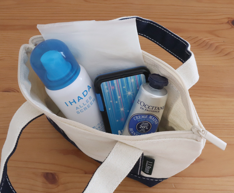 本体も持ち手も厚手の生地でポーチ替わりにも使えます。底マチもあるので花粉防止スプレーやポケットティッシュも入ります。