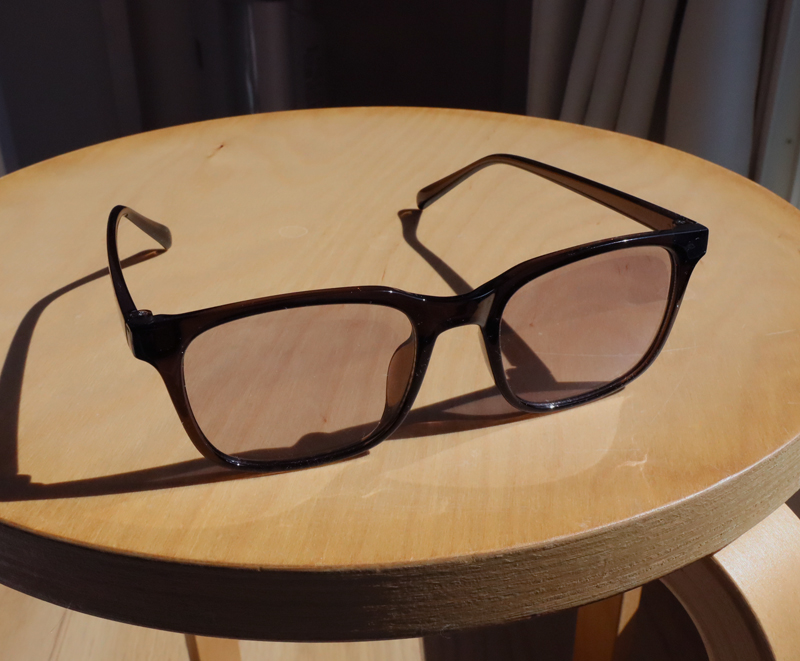 紫外線の量によってレンズの色が変わります。紫外線に当たるとこんな感じ。紫外線カット率99.9%、淡く色が付くので普段使いもしやすそうです。室内ではレンズが透明なのでかけっぱなしでいいのもポイント。