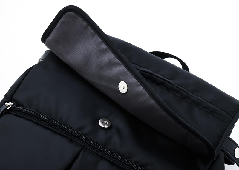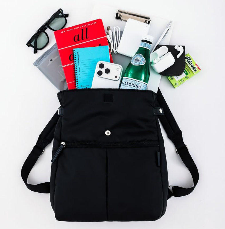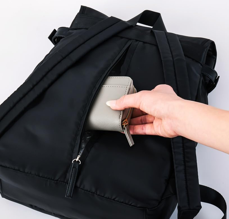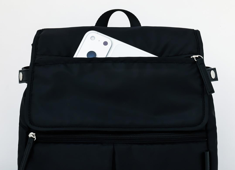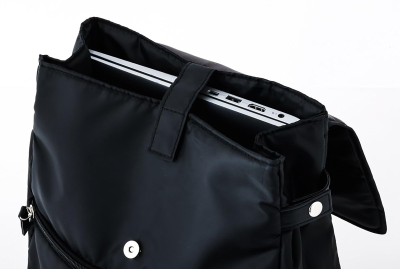 ダイレクトにアクセスできる背面ファスナーや取り出しやすいフラップ部分のポケットなど、人気のギミックはそのままに、ふかふかの中綿入りのナイロン調生地を使って約200gの重さに軽量化。