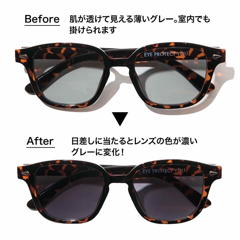 レンズの色は、紫外線に当たると薄いグレーから濃いグレーへと変化。