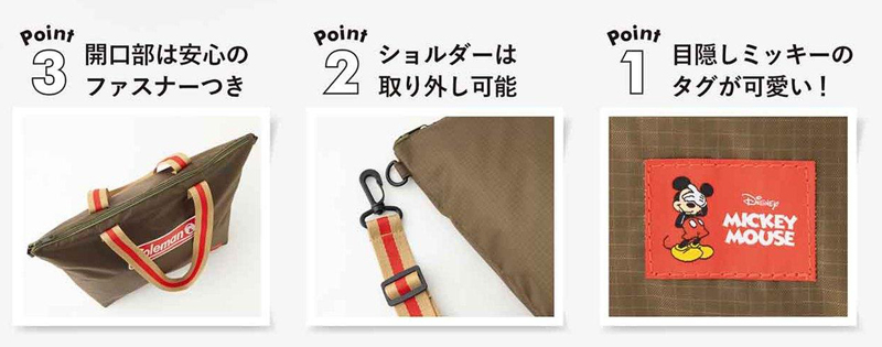 落ち着いたカーキ色のリップストップ生地に、赤いコールマンのロゴと、目を隠したミッキーのタグがアクセント。