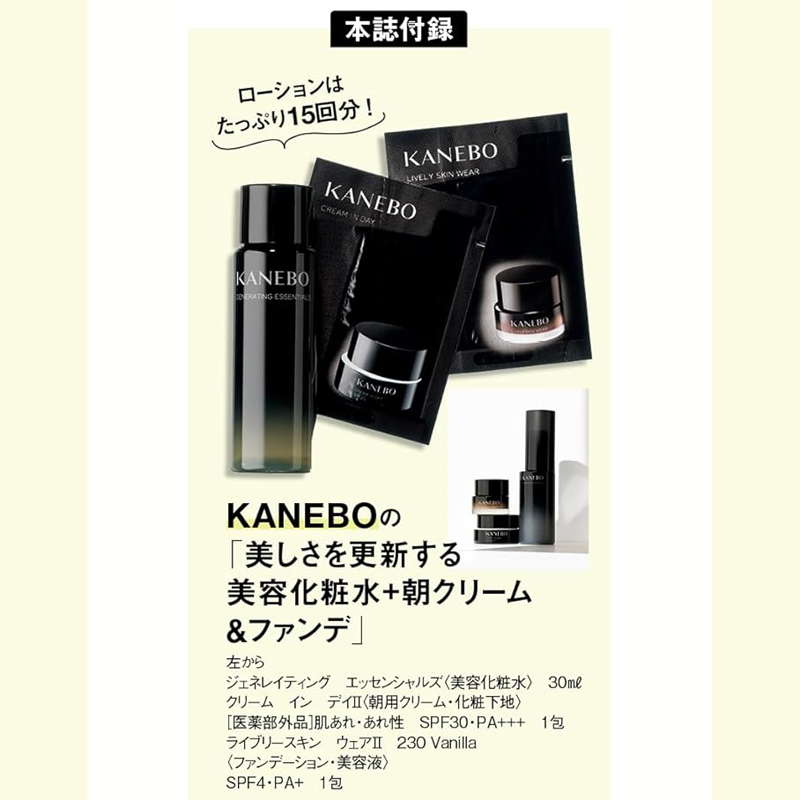 本誌の付録は KANEBOの「美しさを更新する美容化粧水+朝クリーム&ファンデ」です。
