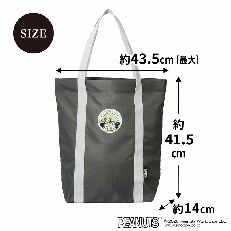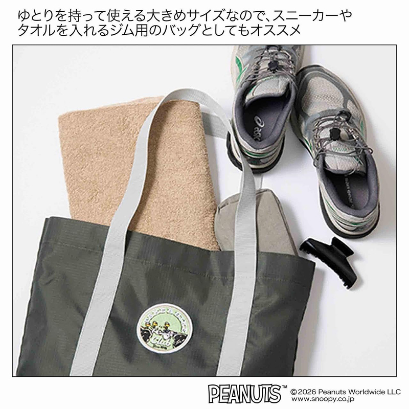 スヌーピーとウッドストックの刺繍ワッペンをポイントにしたおでかけトート。